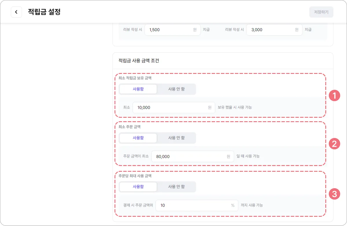 예시로 10,000원의 최소 적립금 보유 금액을 설정했다면, 적립금을 10,000원 이상 보유한 고객들만 구매 시 적립금을 사용할 수 있습니다.