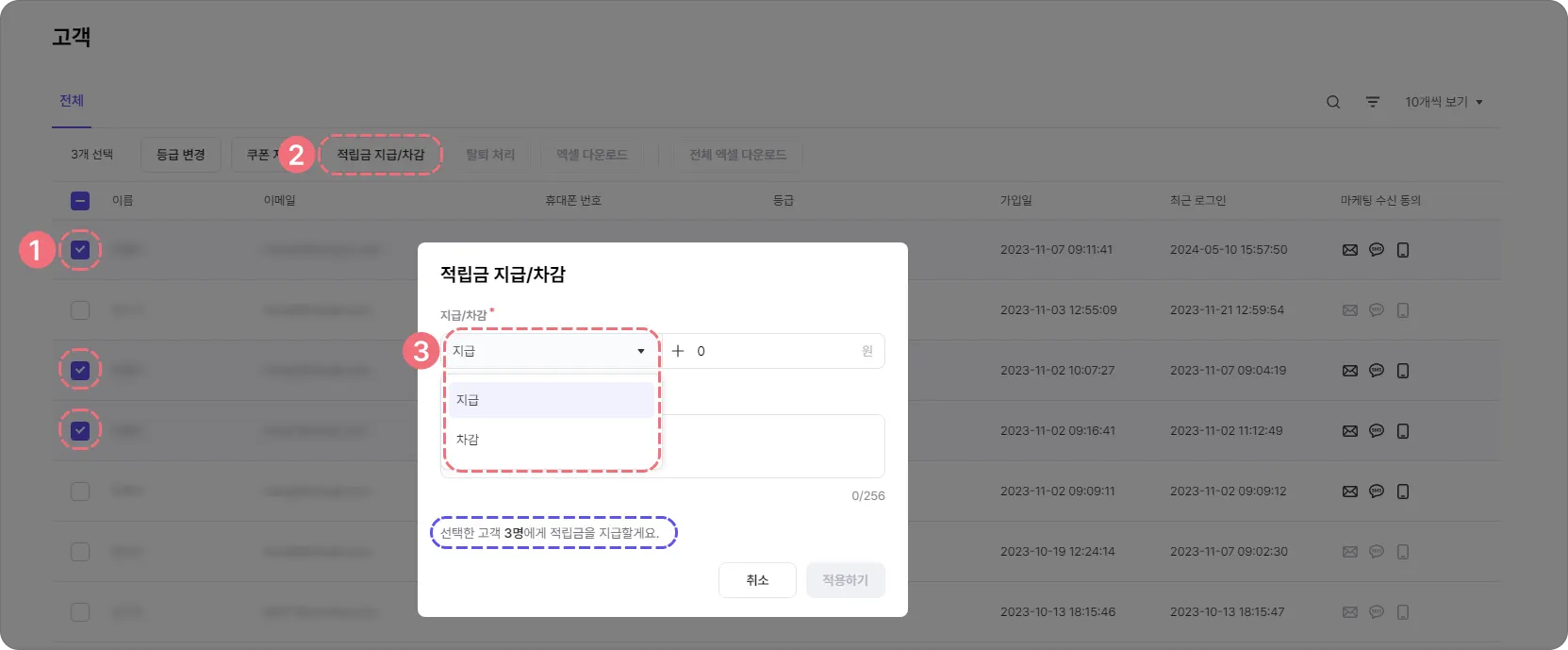 ③ 지급 또는 차감 선택하고 금액 입력 후 적용하기 클릭