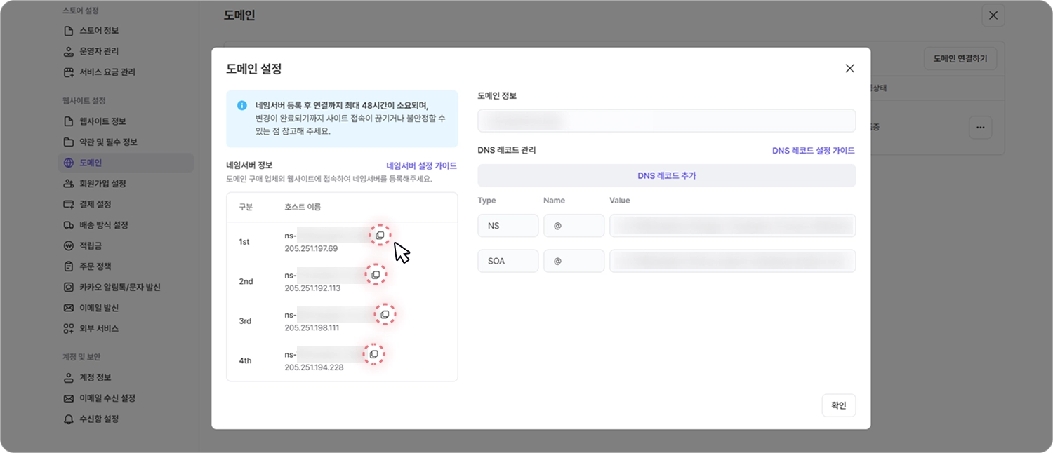 웹메일 이용 등 DNS 레코드 설정이 필요하다면, 아래 과정을 추가 진행해 주세요.