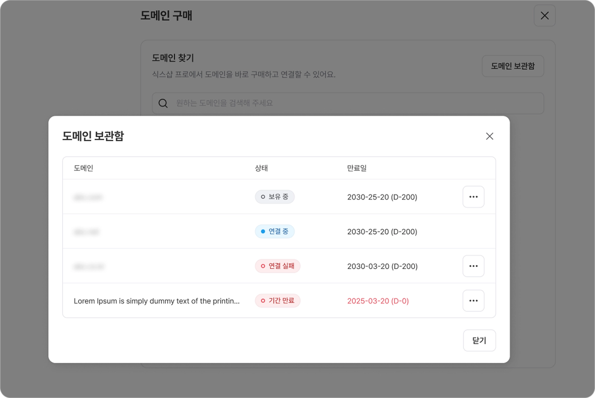 도메인 보관함에서 구매 도메인 목록을 확인할 수 있으며, 각 도메인의 상태, 만료일, 잔여일(D-day)이 함께 표시됩니다.