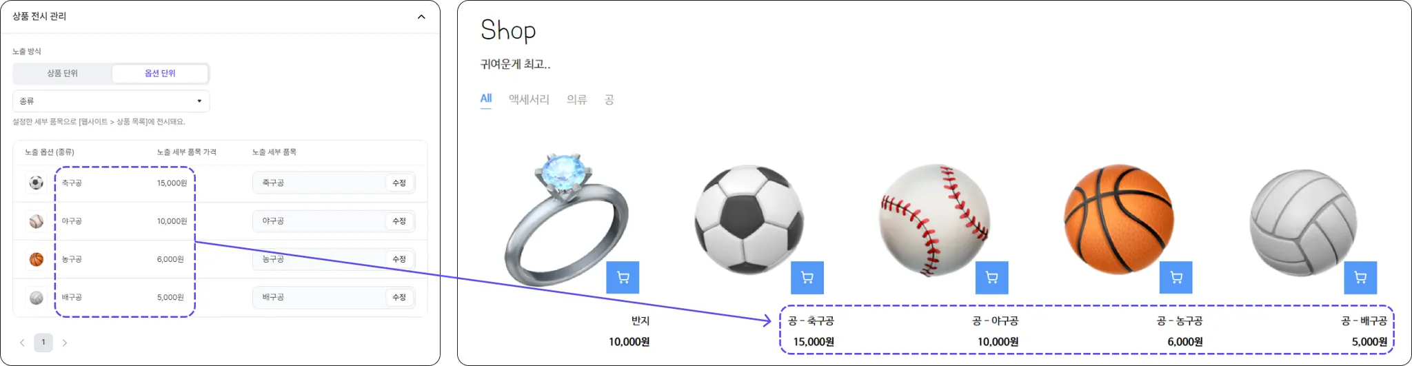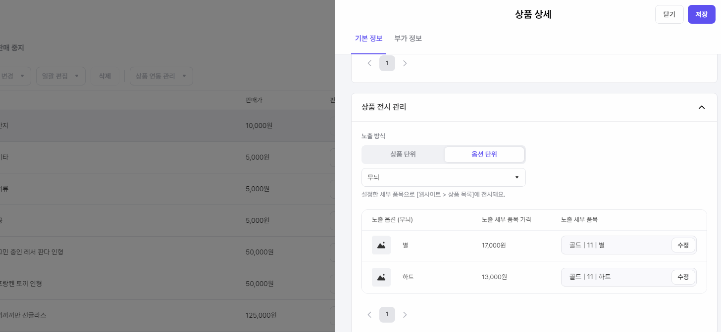 옵션 단위로 선택하면 노출 옵션과 노출 세부 품목 가격이 표시됩니다.