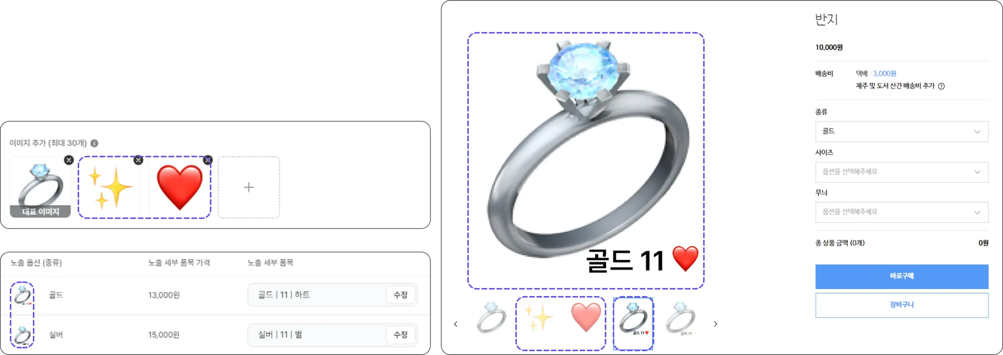 세부 품목에 등록한 이미지는 해당 세부 품목의 대표 이미지로 노출되며, 상품 상세 페이지에서 해당 상품의 대표 이미지, 추가한 이미지, 세부 품목 이미지 순으로 슬라이드 됩니다.