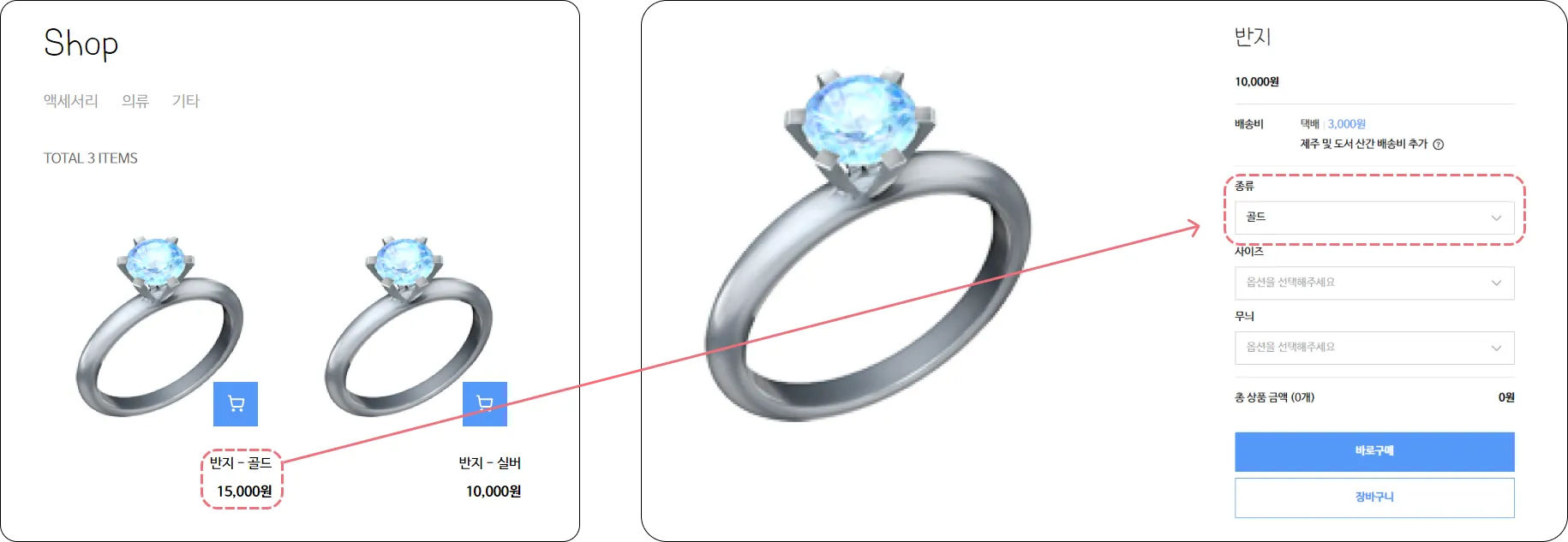 웹사이트에서 옵션 단위로 상품이 노출됩니다.