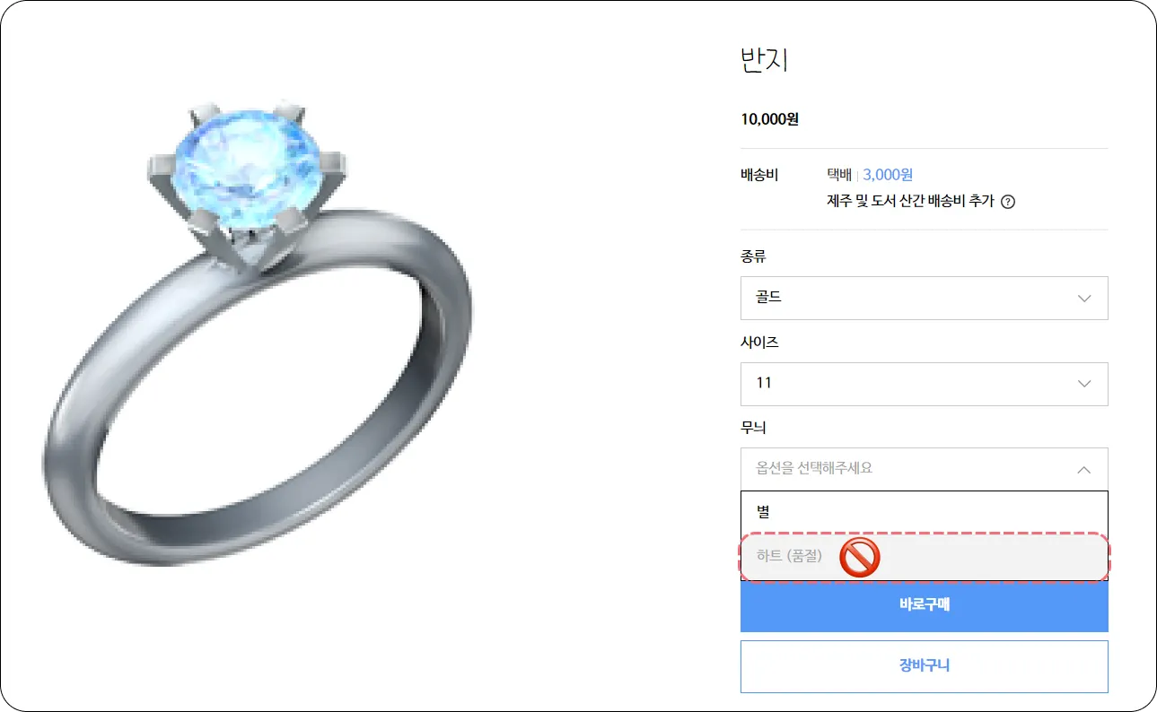 기준이 되는 옵션 중 일부 세부 품목만 일시 품절일 경우, 품절 표시가 되지 않지만, 상품 상세 페이지에서 해당 옵션 선택 시 품절로 표시되어 구매할 수 없어요.
