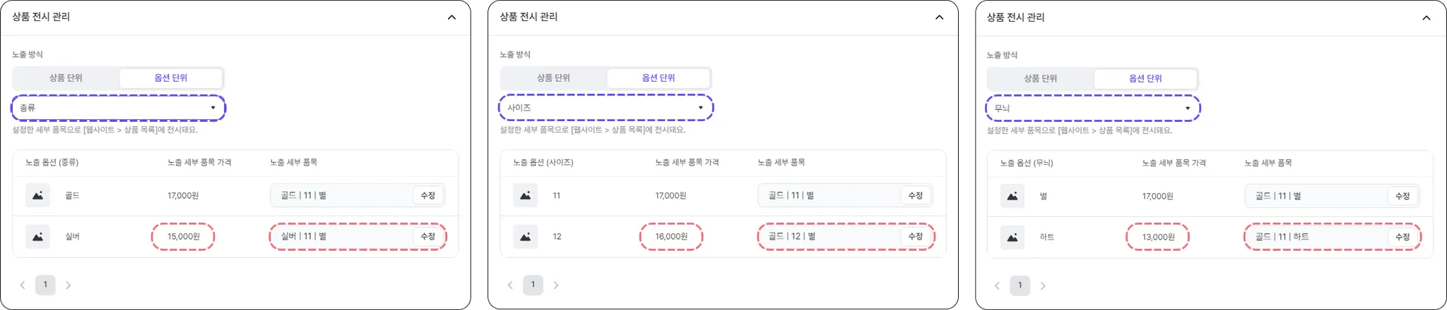 선택된 노출 세부 품목의 가격으로 상품이 전시됩니다.