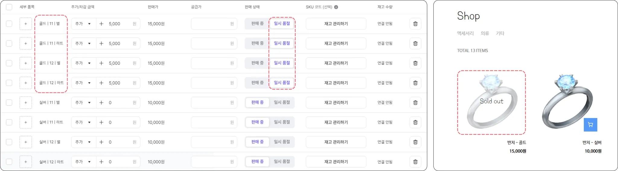 기준이 되는 옵션의 세부 품목의 판매 상태가 모두 일시 품절이거나 연결된 재고가 0인 경우, 웹사이트에서 품절로 표시됩니다.