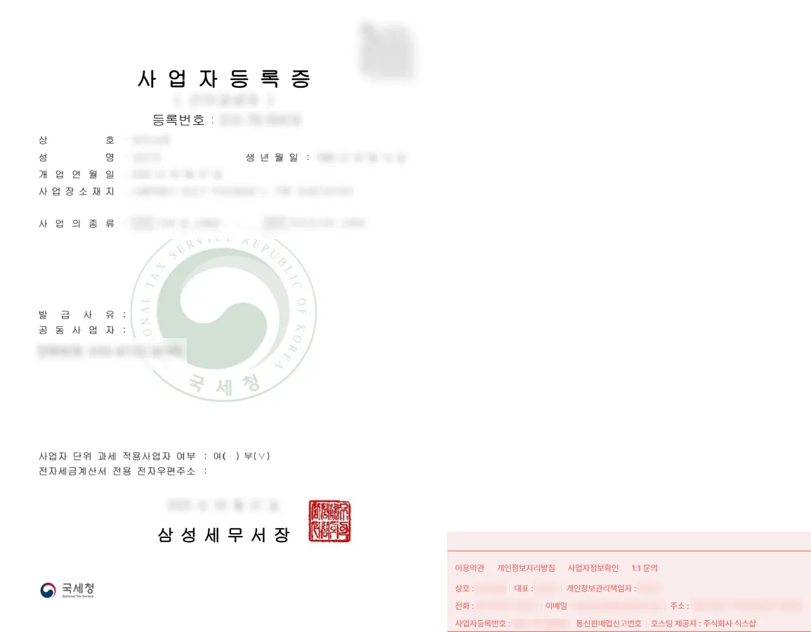 사업자 등록증과 웹사이트 푸터의 사업자 정보를 하나의 이미지 파일로 만들고 [사업자등록증] 항목에 업로드 해주세요.