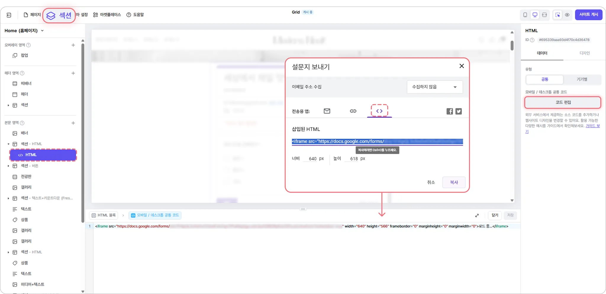 구글 폼 오른쪽 상단 보내기 를 클릭하고, < >를 눌러 HTML 코드를 복사해 주세요.