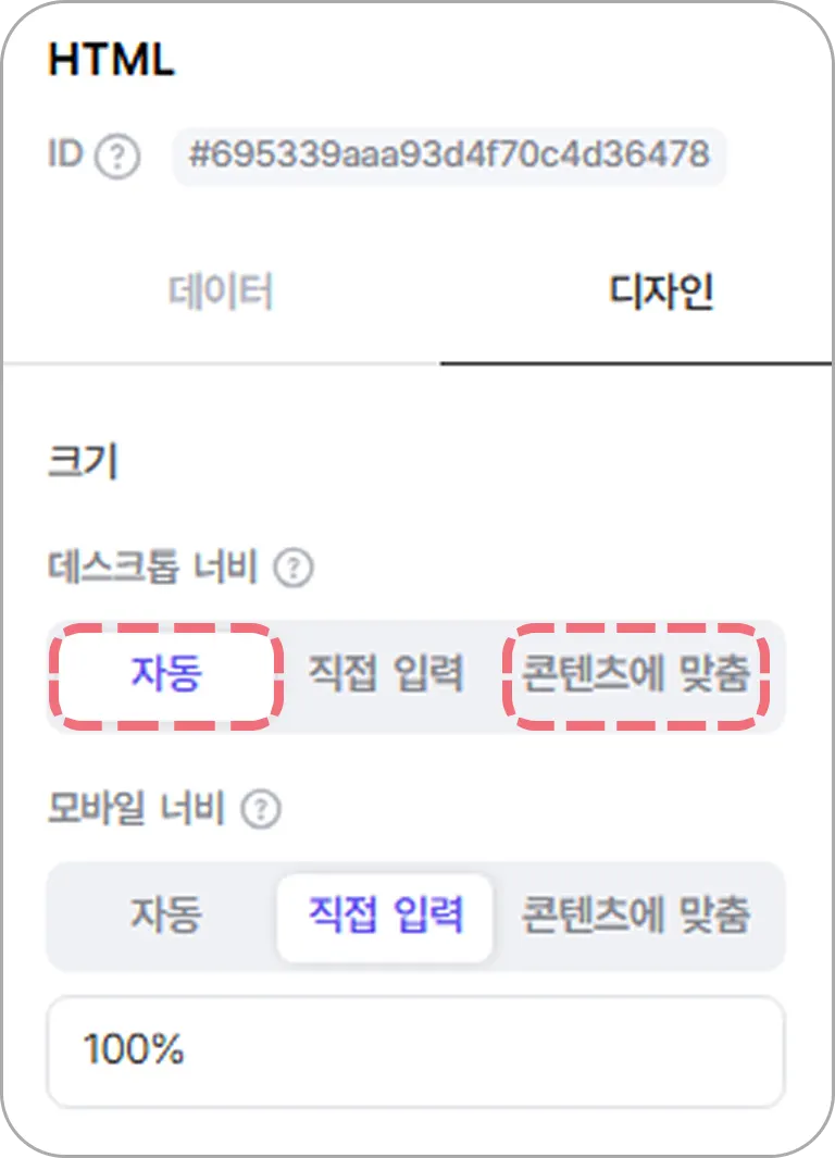HTML 블록의 디자인 탭에서 데스크톱 너비 설정을 자동 또는 콘텐츠에 맞춤으로 선택하면 가운데 정렬됩니다.