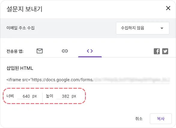 설문지 보내기 하단에서 원하는 너비를 입력할 수 있어요.