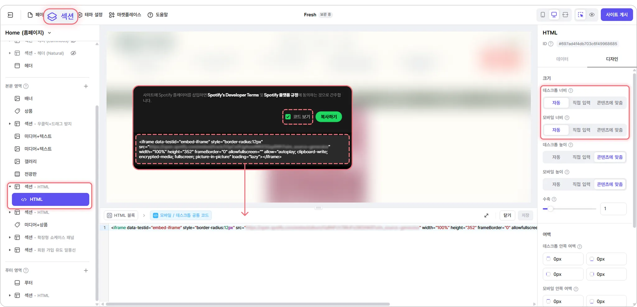 공통 유형에 입력하거나, 기기별 선택하여 모바일/데스크톱 코드에 각각 입력할 수 있어요. 디자인 탭에서 너비를 직접 입력으로 선택하고 코드의 height="값”을 조정하면 삽입된 트랙의 높이를 변경할 수 있습니다.