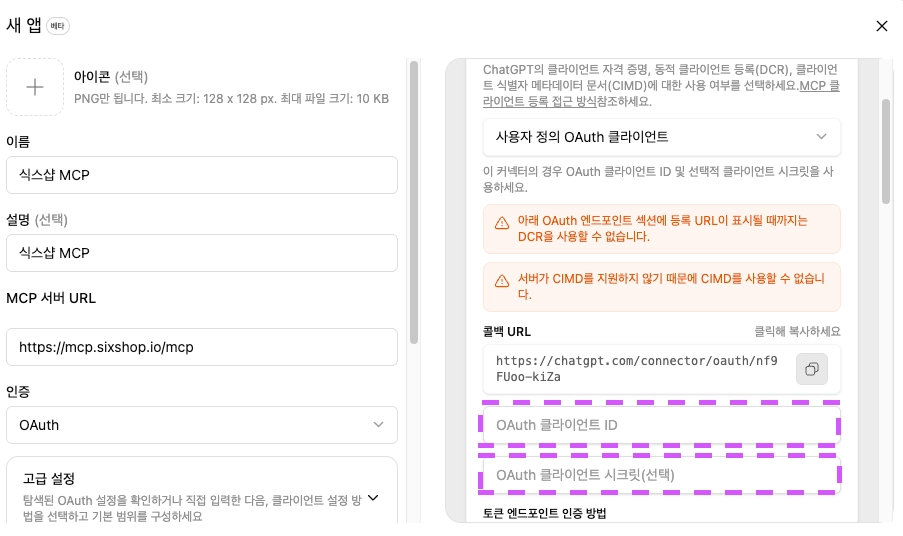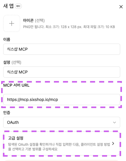 이름, 아이콘, 설명은 아무 값이나 넣어도 됩니다.