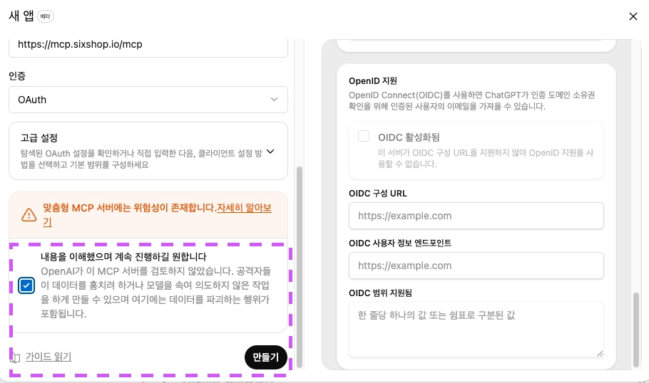 6. 동의 체크 → 만들기 를 클릭해 주세요