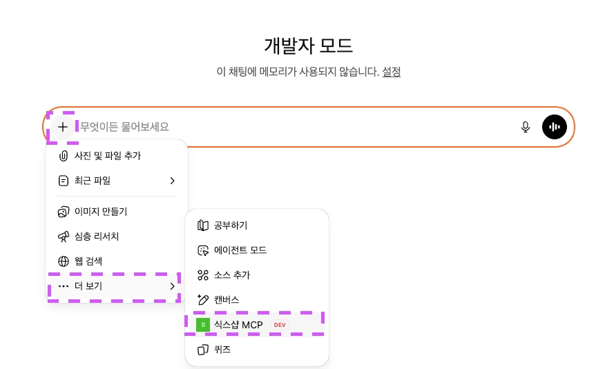 8. + 버튼 클릭 → 더 보기 → 추가한 MCP를 선택 해주세요