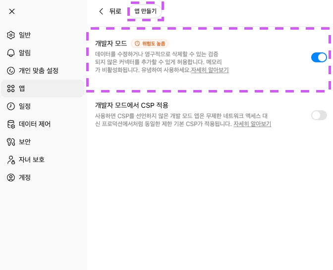3. 개발자 모드를 켜고 → 앱 만들기를 클릭 해주세요