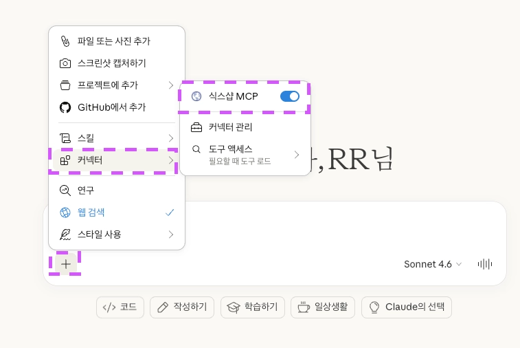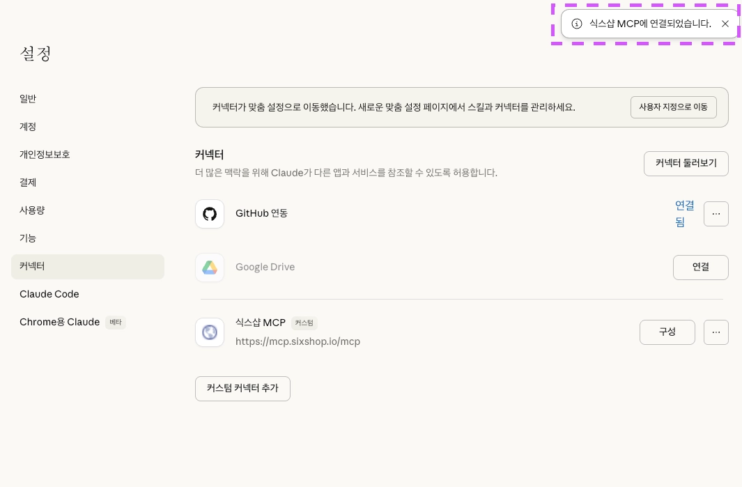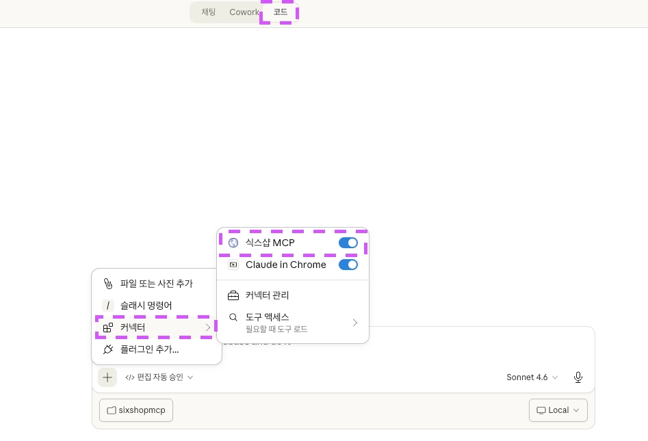 Claude 앱 내 Claude Code 에서도 연동된 MCP를 사용할 수 있습니다.