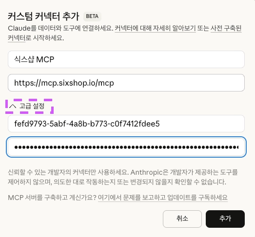 4. 고급 설정을 열고, 정보를 입력해 주세요.
