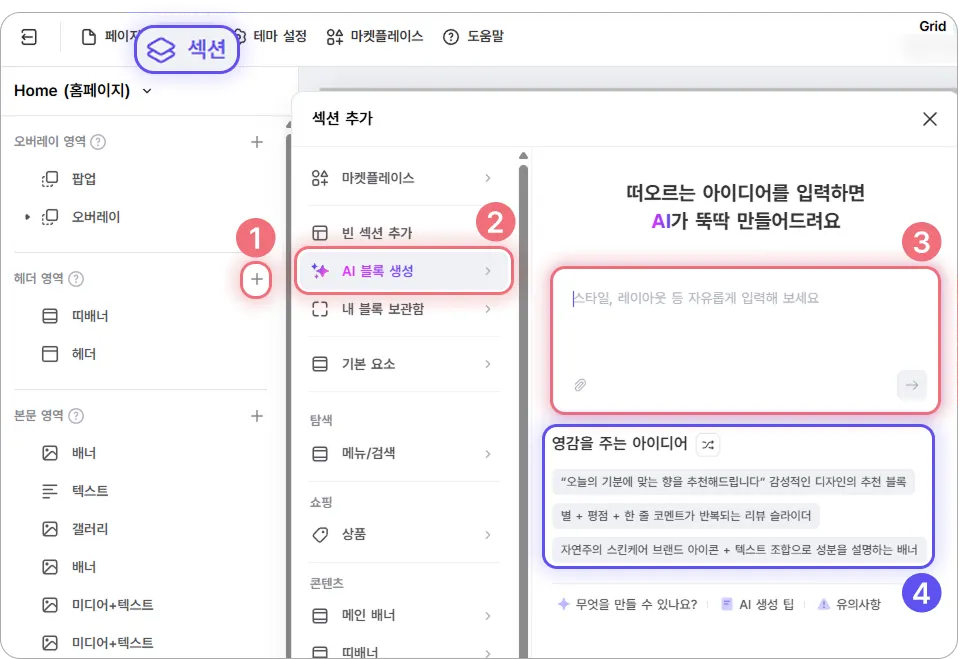 마켓플레이스에서 원하는 디자인과 유사한 커스텀 블록을 설치한 뒤, AI로 부분 수정해 보세요.