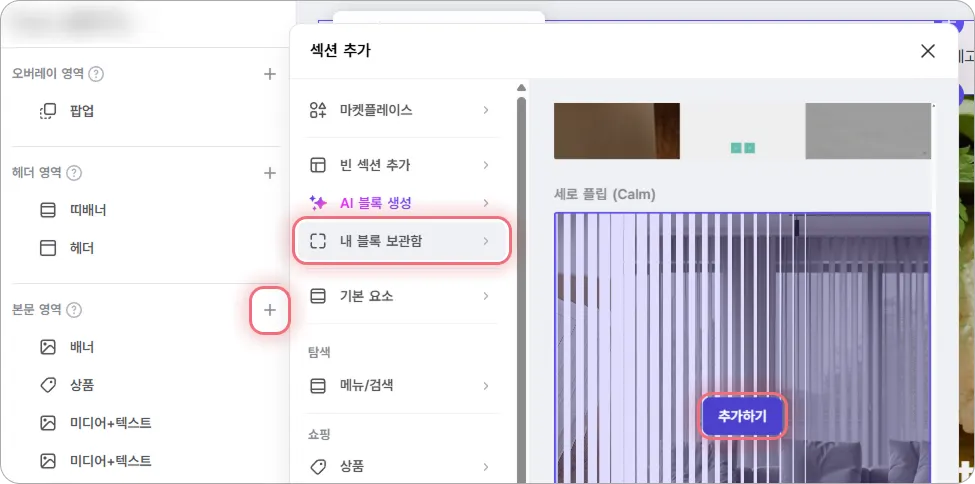 ① 디자인 에디터 상단 [섹션] 선택 후, 섹션 리스트에서 [+(섹션 or 블록 추가)] 클릭