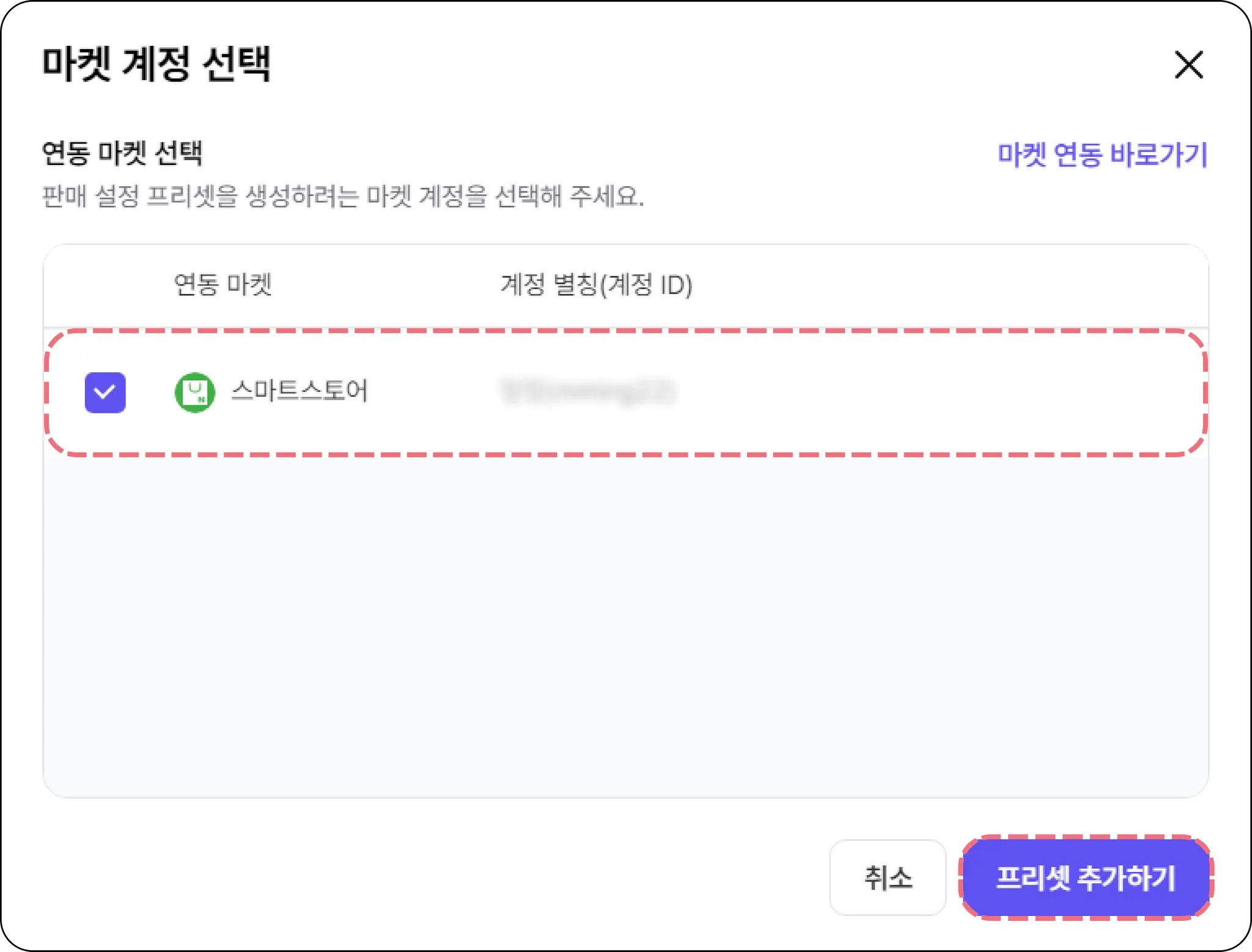 ② 추가할 마켓 계정 선택하고 프리셋 추가하기 클릭해 주세요.