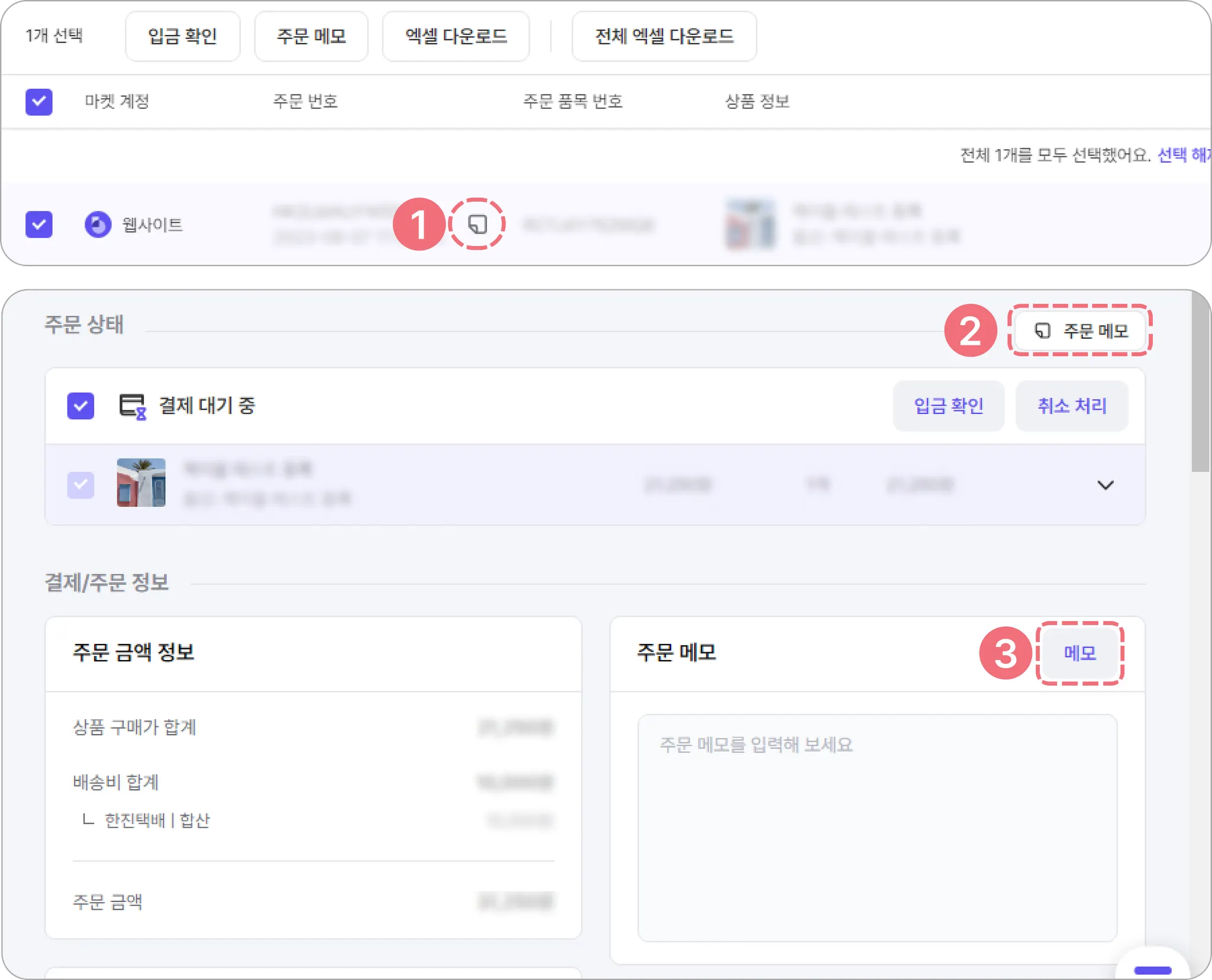 예시 : 주문 중 품목 1개는 주문 확인 중이고 다른 품목 1개는 배송 완료일 때, 주문 메모를 남기면 주문 확인 중 상태의 주문 품목에도 주문 메모가 있다고 표시되고, 배송 완료 상태의 주문 품목에도 주문 메모가 있다고 표시됩니다.