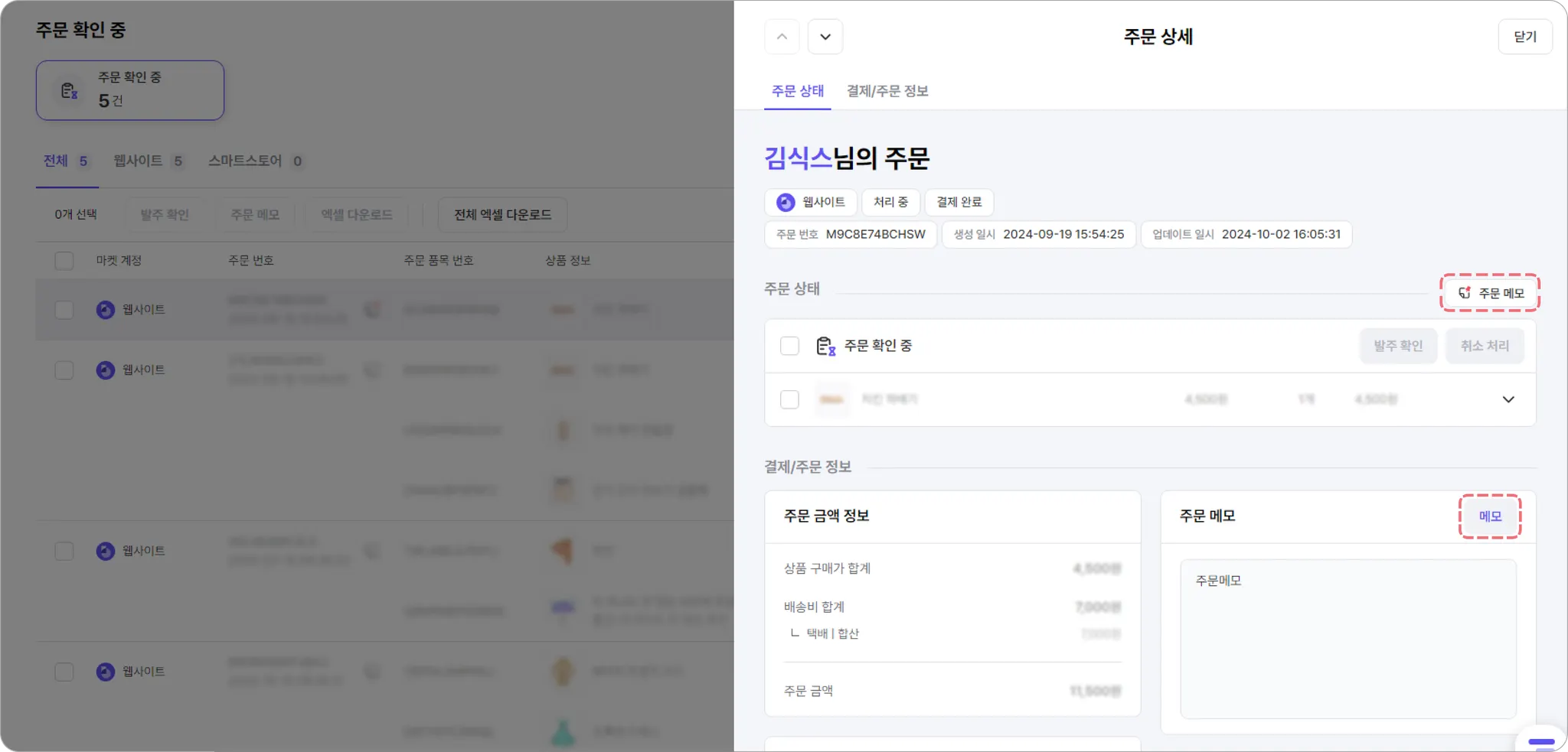 주문 메모 아이콘을 클릭하고 모달에서 메모 내용을 수정하거나 삭제할 수 있습니다.