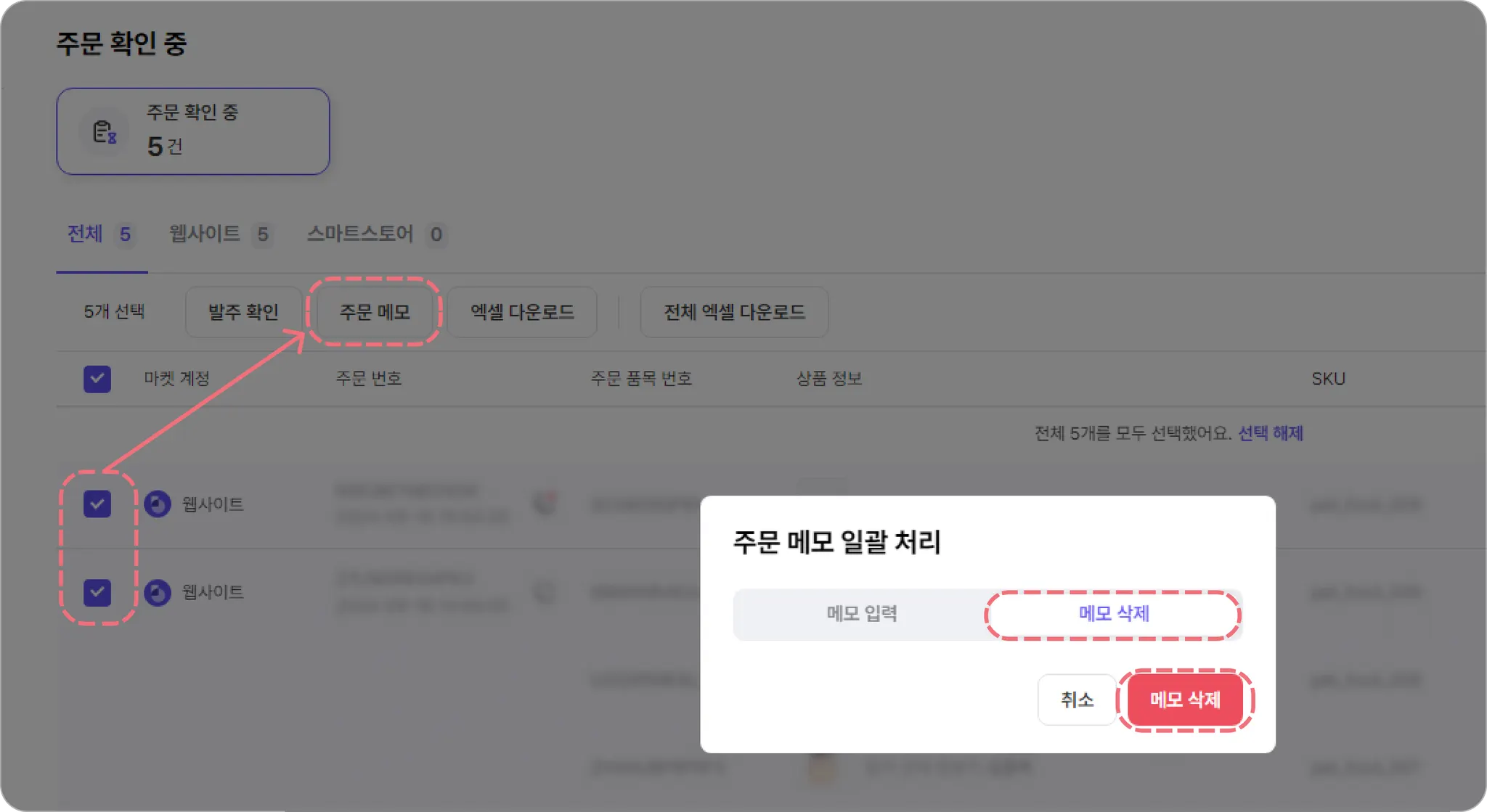 주문 메모를 삭제할 주문의 체크박스에 체크하고 주문 메모를 클릭해 메모 삭제를 선택해 주시면 됩니다.
