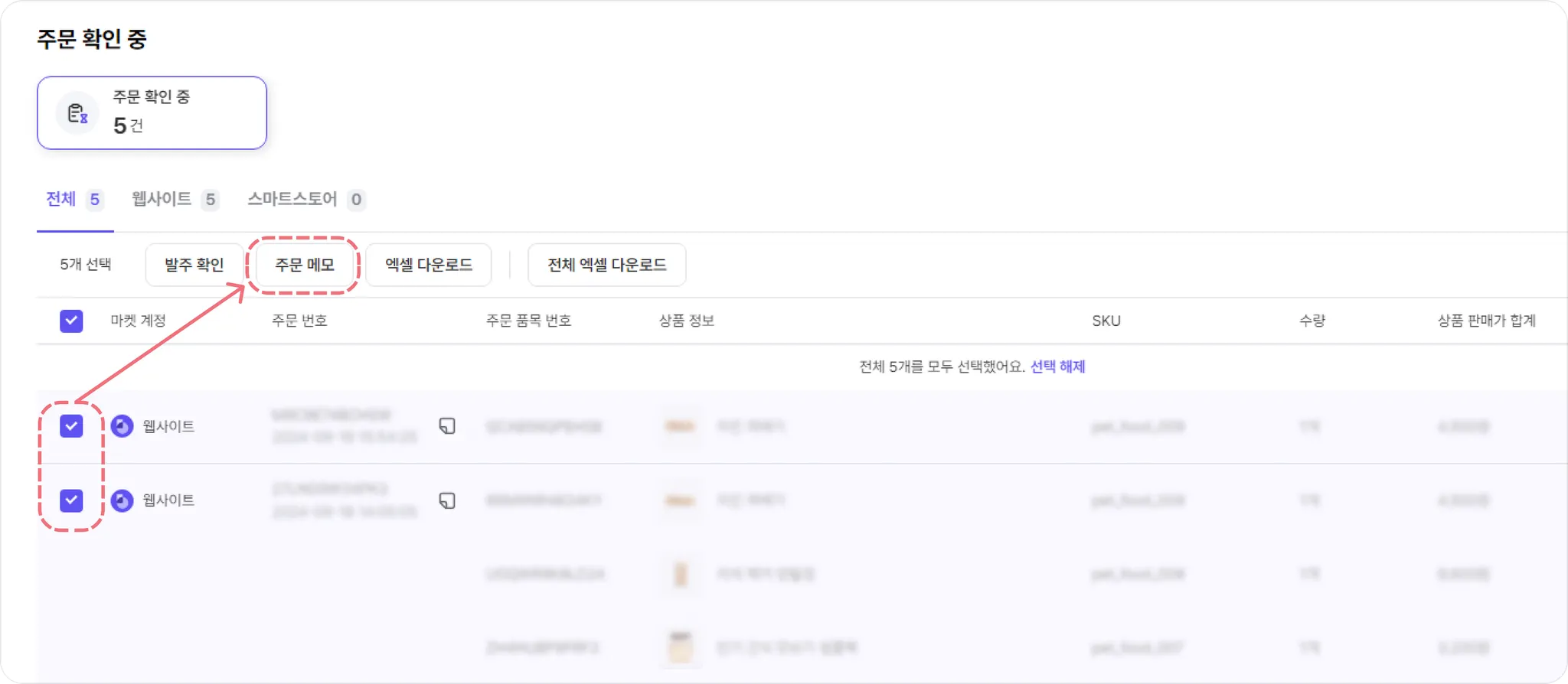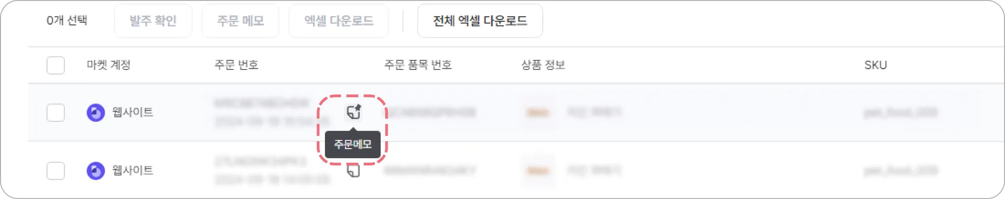 메모를 작성할 주문의 체크박스에 체크하고 주문 메모를 클릭해 주세요.