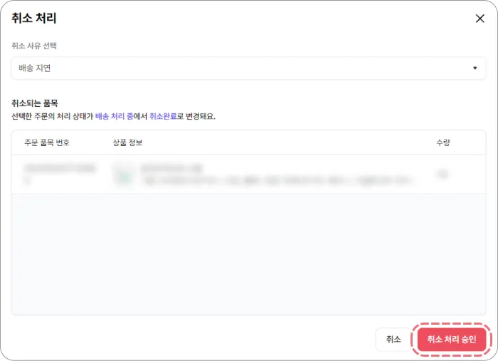 취소 사유를 선택한 후 취소 처리 승인 클릭