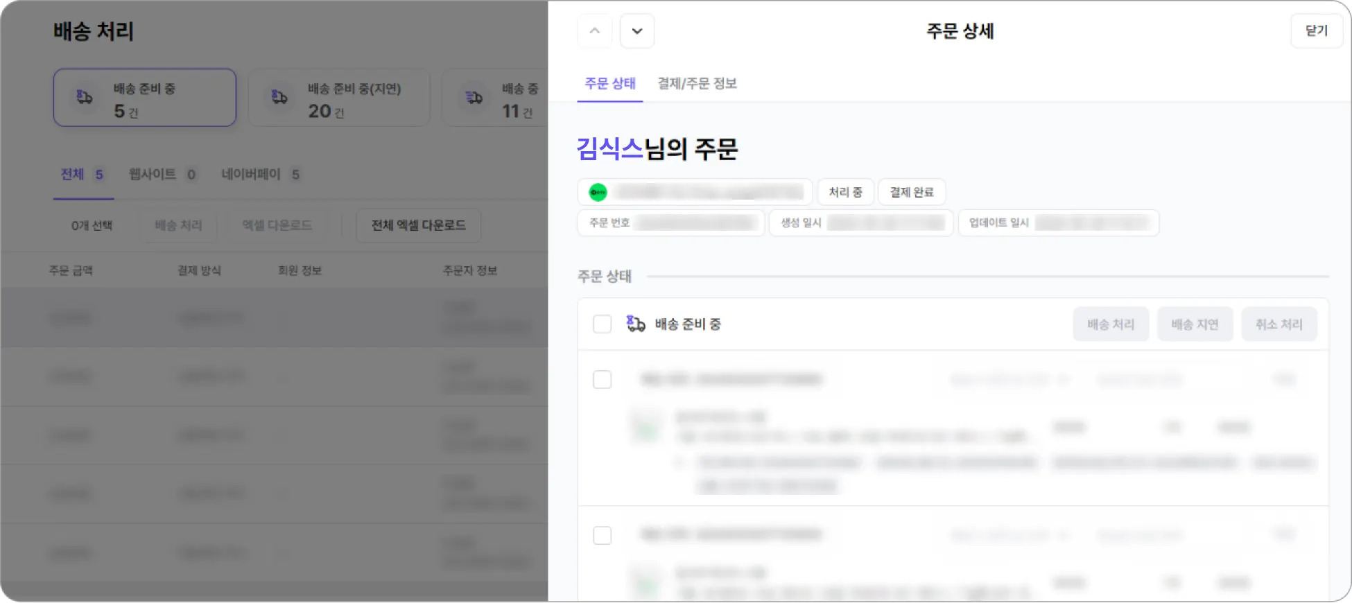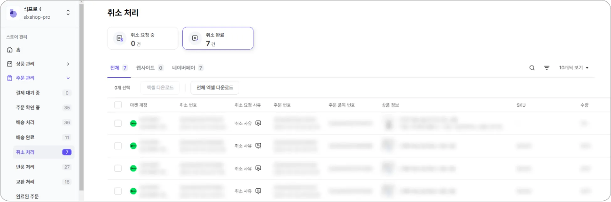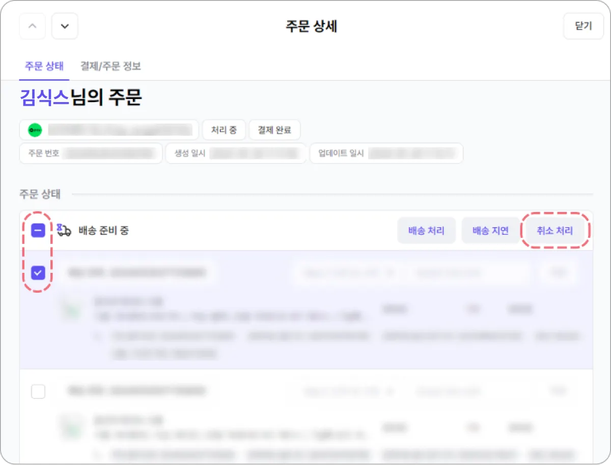 직접 취소 처리는, 주문 상세 페이지에서 개별 처리해 주셔야 합니다.