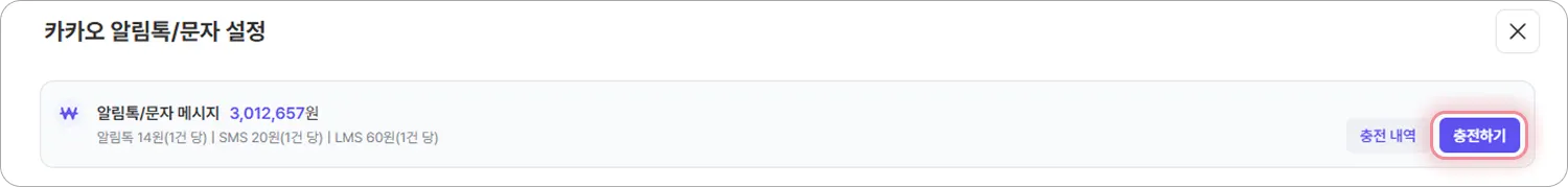 [설정 > 카카오 알림톡/문자 발신]의 충전하기를 클릭하여 알림톡/문자 메시지 발송에 필요한 포인트를 충전할 수 있습니다.