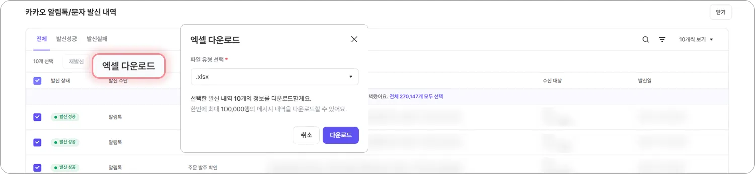 알림톡/문자 메시지 발신 내역을 편리하게 확인하고 다운로드할 수 있습니다.