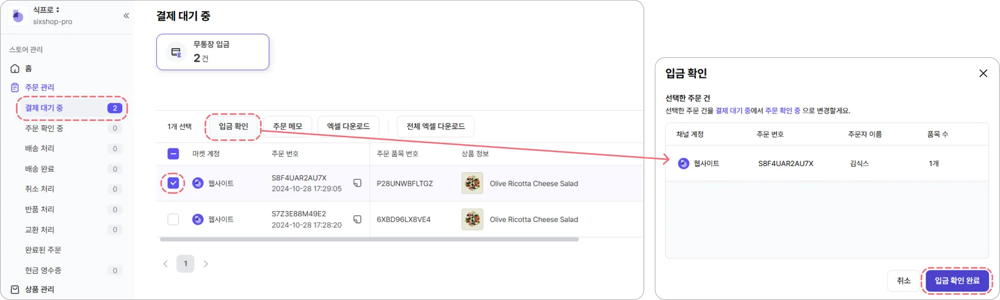 ② [입금 확인] 버튼 클릭 > 선택한 주문 목록 확인 후 입금 확인 완료 버튼 클릭