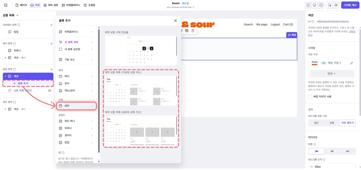 ② [쇼핑(상품 목록) > 섹션 > 본문 영역 + 섹션 추가 > 쇼핑(예약) > 예약 상품 목록 블록 추가] 진행해 주세요.