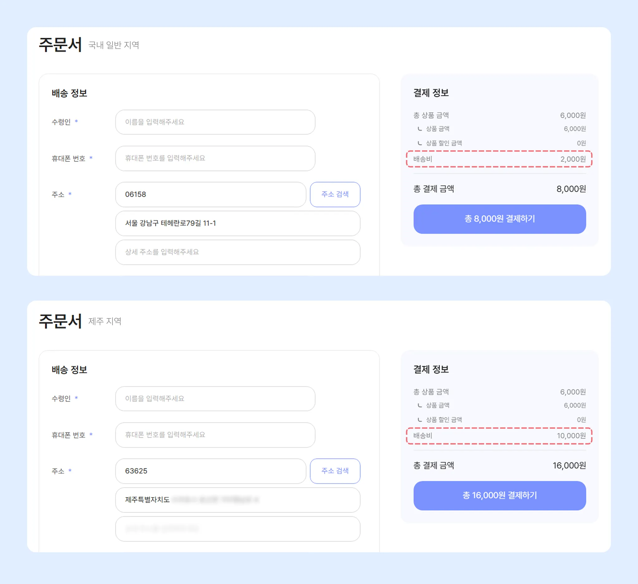장바구니 페이지에서는 국내 일반 지역 기준으로 묶음 배송비가 적용되며, 주문서 페이지에서 주소를 입력하면 총 배송비가 더 비싼 배송 방식으로 다시 설정됩니다.