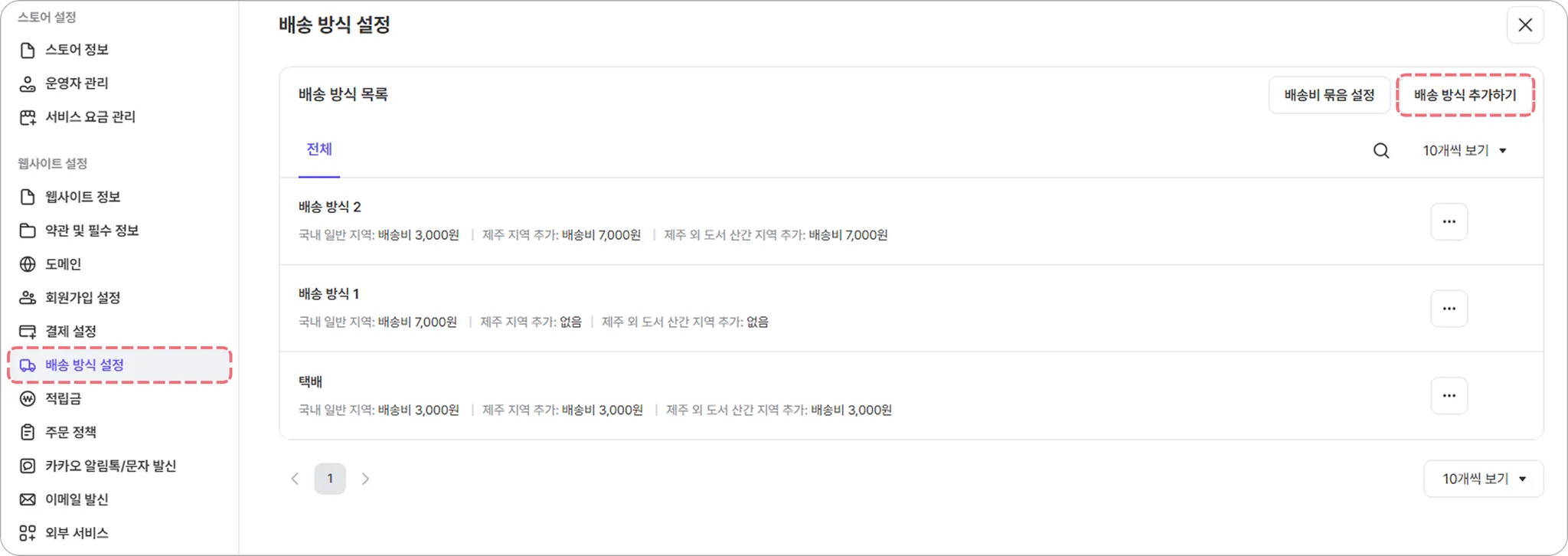 ② 오른쪽 상단 배송 방식 추가 하기 클릭