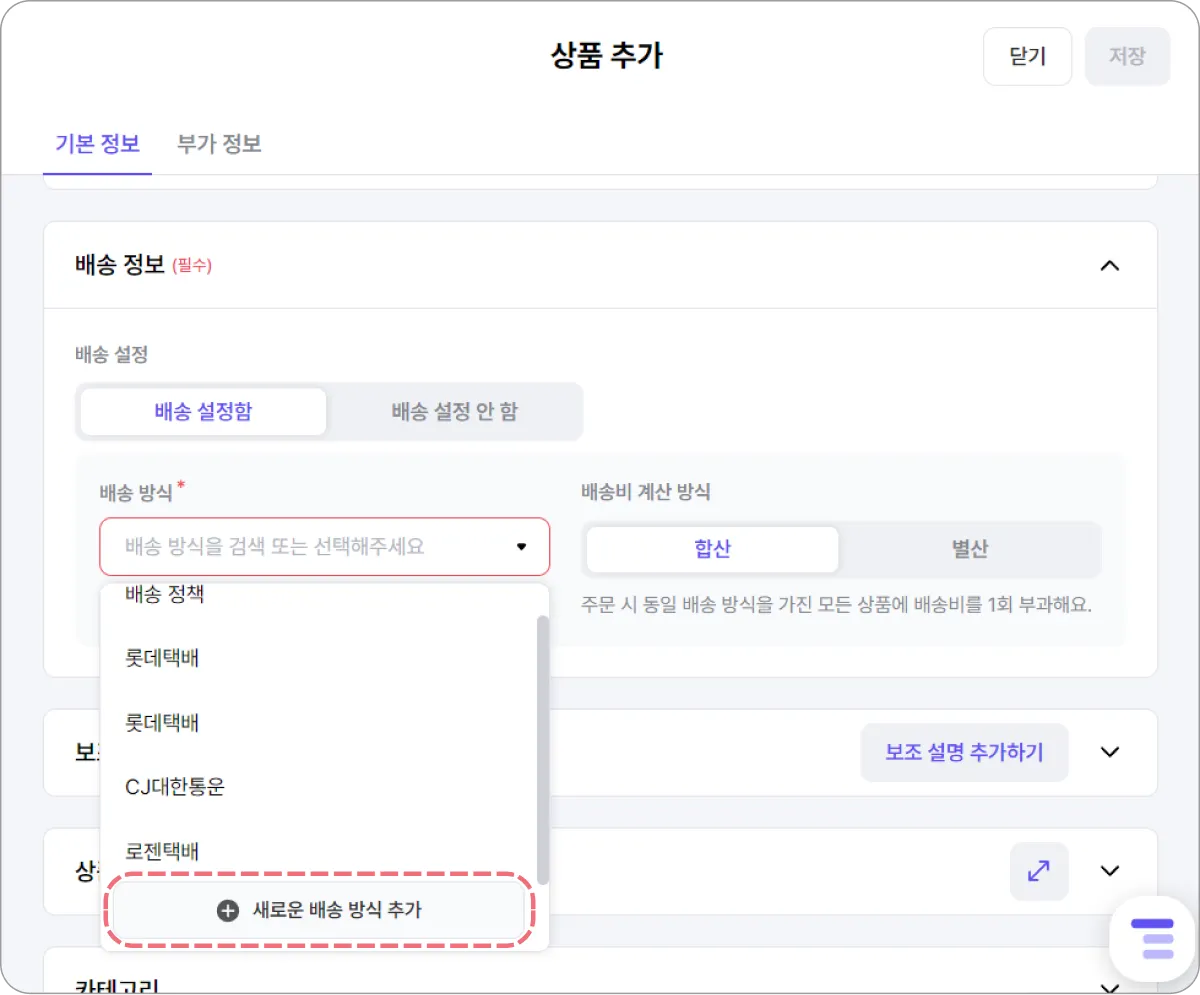 ⑥ 배송 방식 추가 창 하단 추가하기 클릭