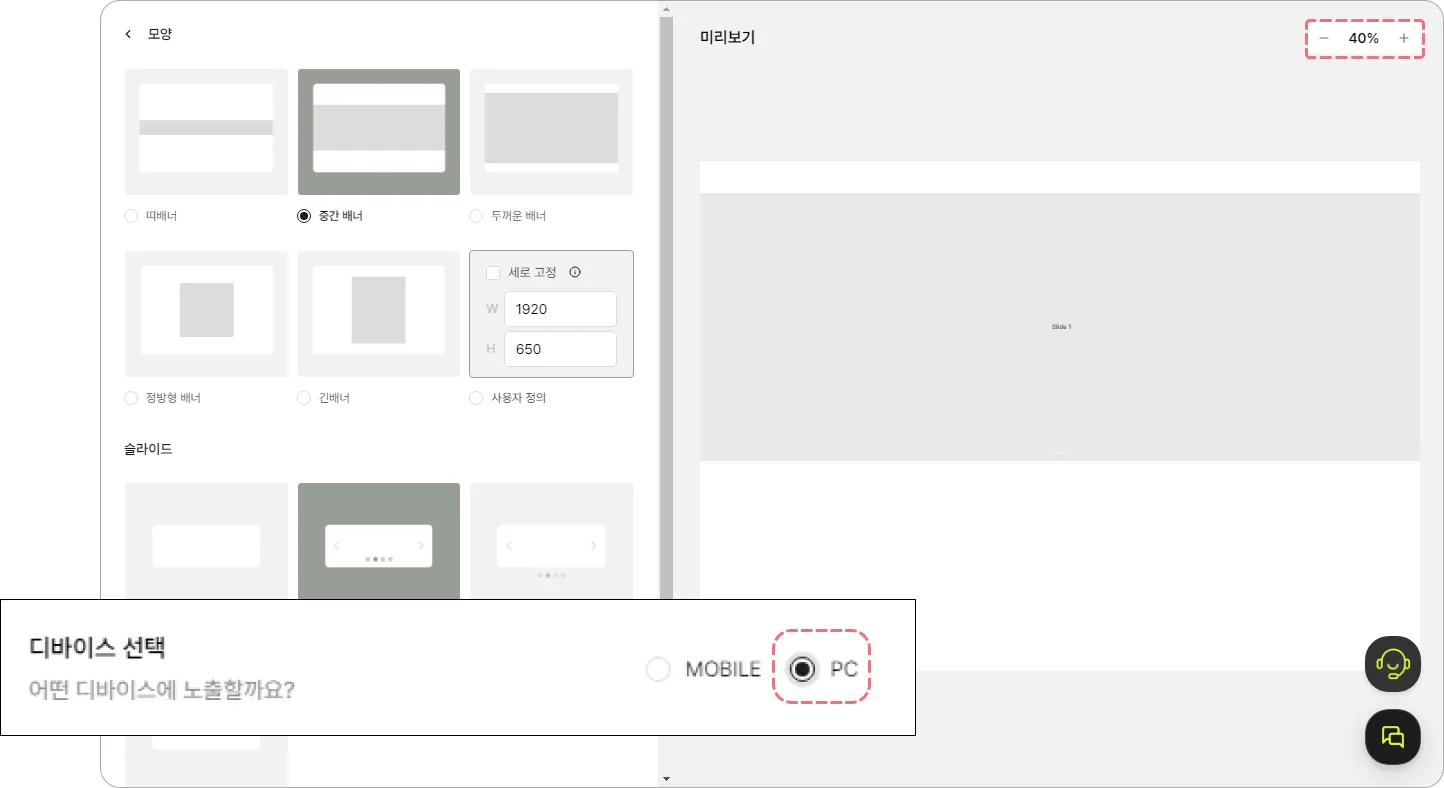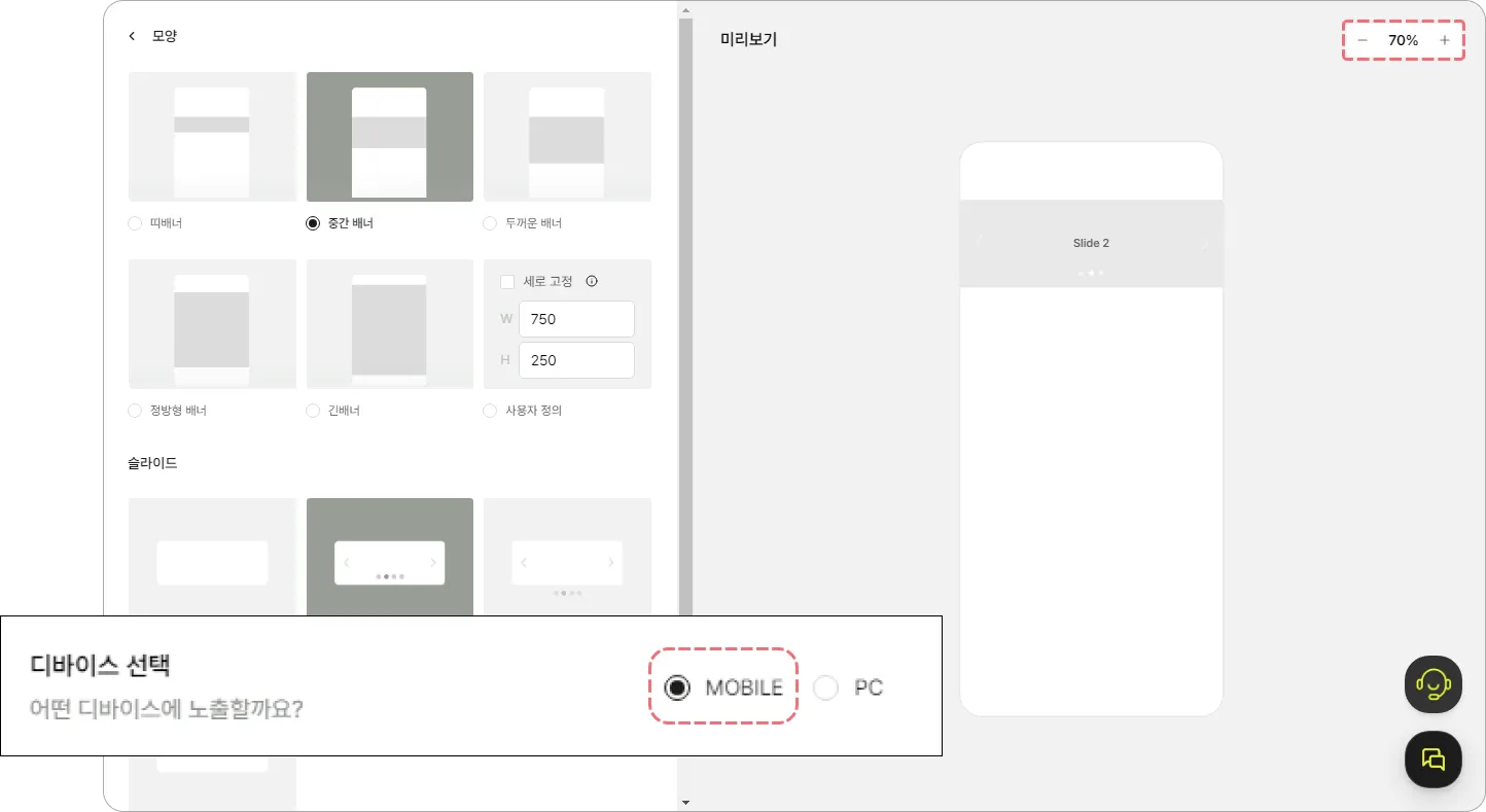 모바일과 PC 중 노출할 기기를 선택해 주세요.