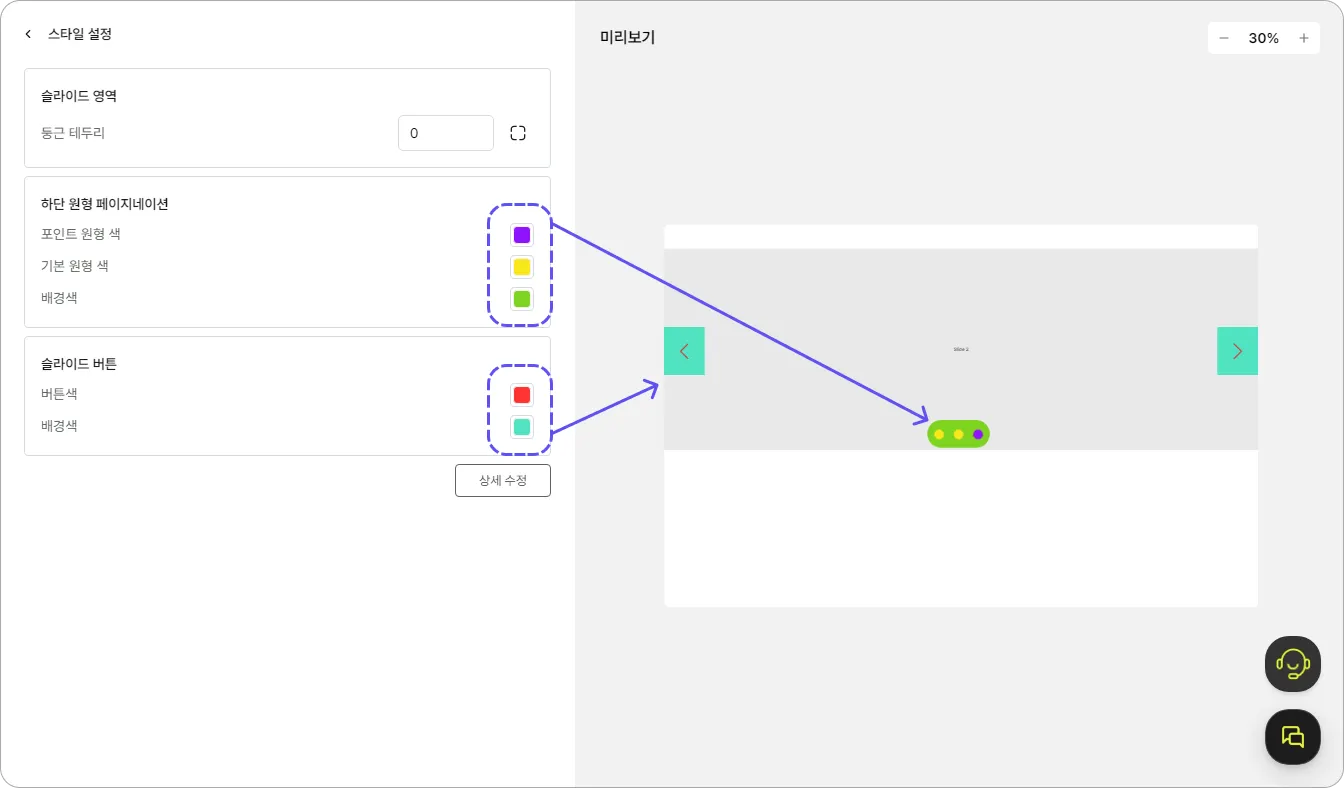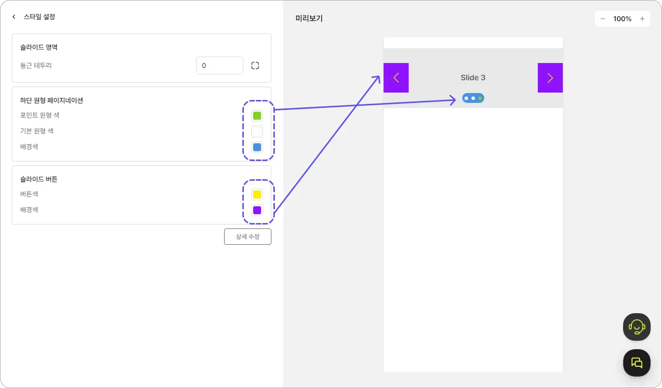 하단 원형 페이지네이션: 슬라이드 설정을 사용하는 경우 페이지 넘김 표시 색상을 선택할 수 있어요.
