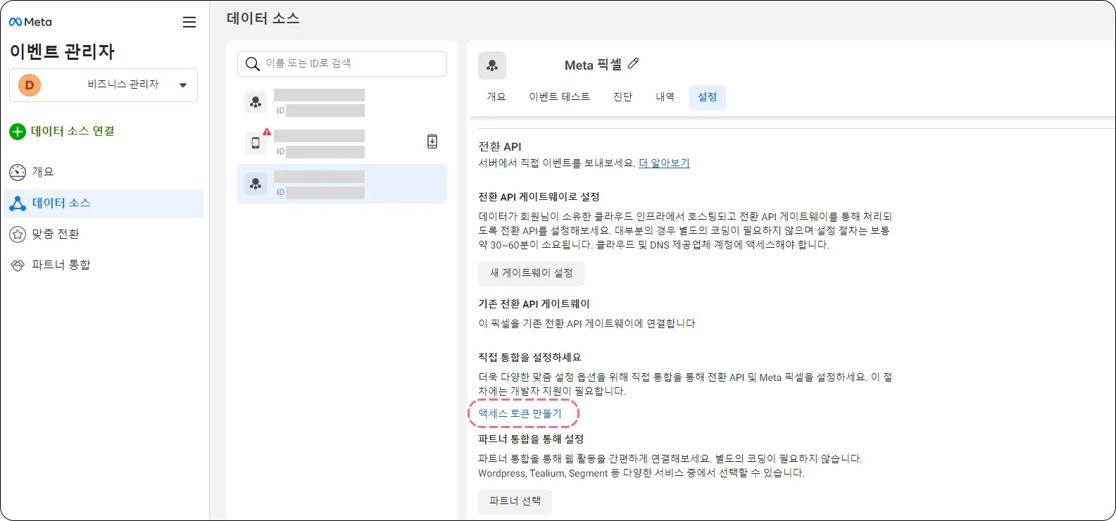 엑세스 토큰은 전환 API 항목의 엑세스 토큰 만들기 버튼을 클릭하면 나타나는 토큰입니다.