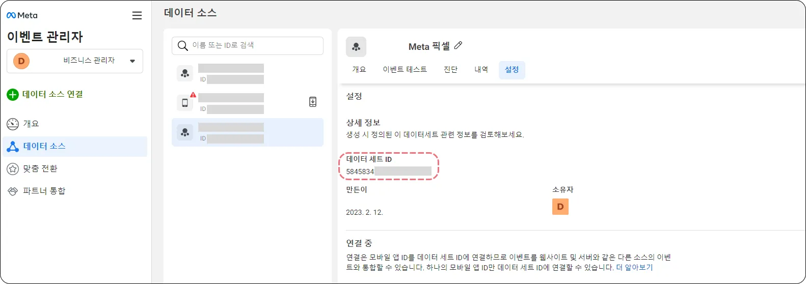 메타 픽셀 ID는 상세 정보 항목의 데이터 세트 ID입니다.