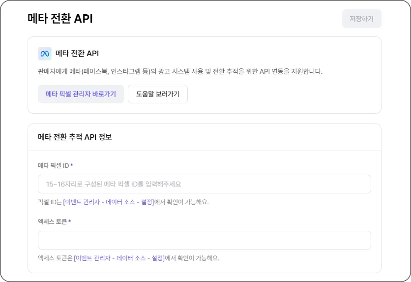 메타 전환 추적 API 이용에 필요한 메타 픽셀 ID와 엑세스 토큰을 입력할 수 있습니다.