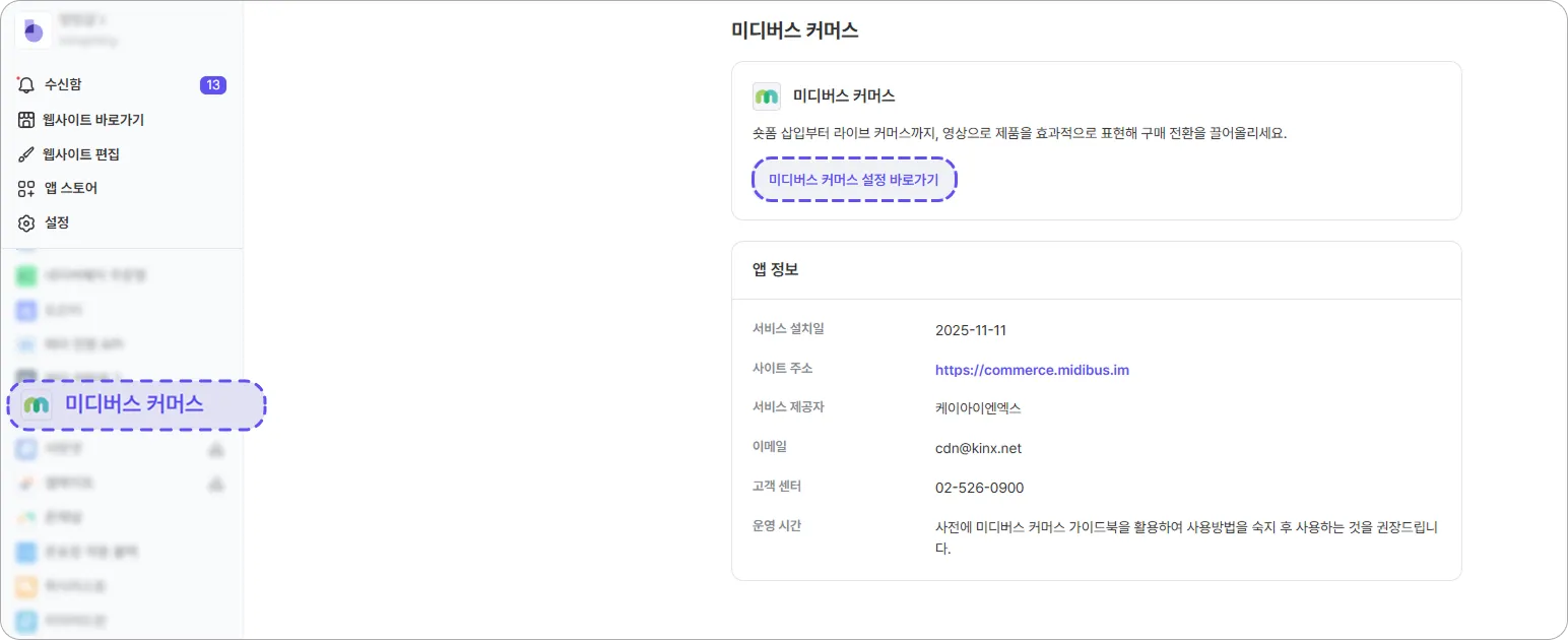 Step 2. 미디버스 커머스 앱으로 이동해 미디버스 커머스 설정 바로가기를 클릭해 주세요.