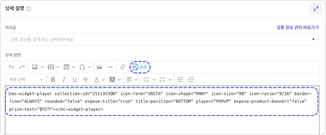 Step 4. 미디버스 커머스에서 복사한 숏폼/컬렉션/위젯 코드를 붙여넣고 저장합니다.