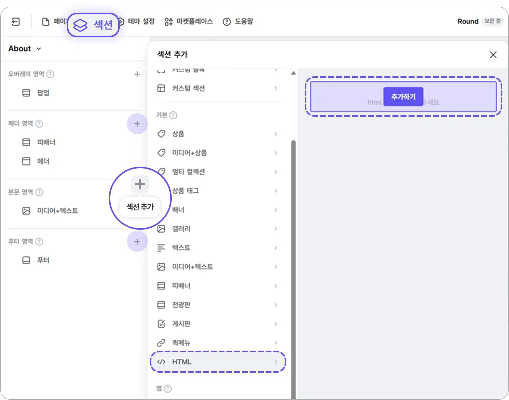 Step 2. 섹션 메뉴에서 HTML 섹션을 선택해 원하는 위치에 추가해 주세요.