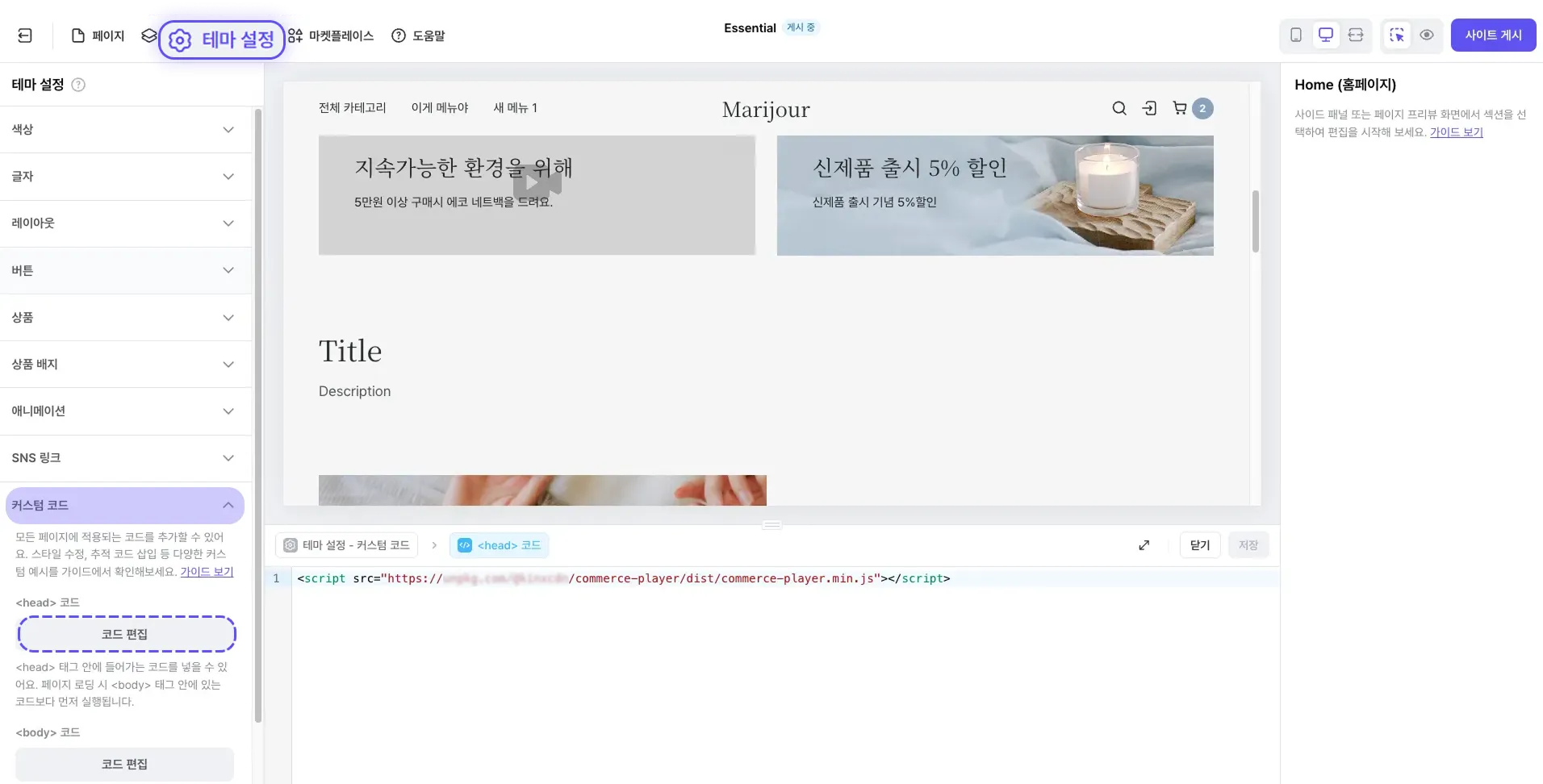경로: 웹사이트 편집 > 테마 설정 > 커스텀 코드 > <head> 코드 편집