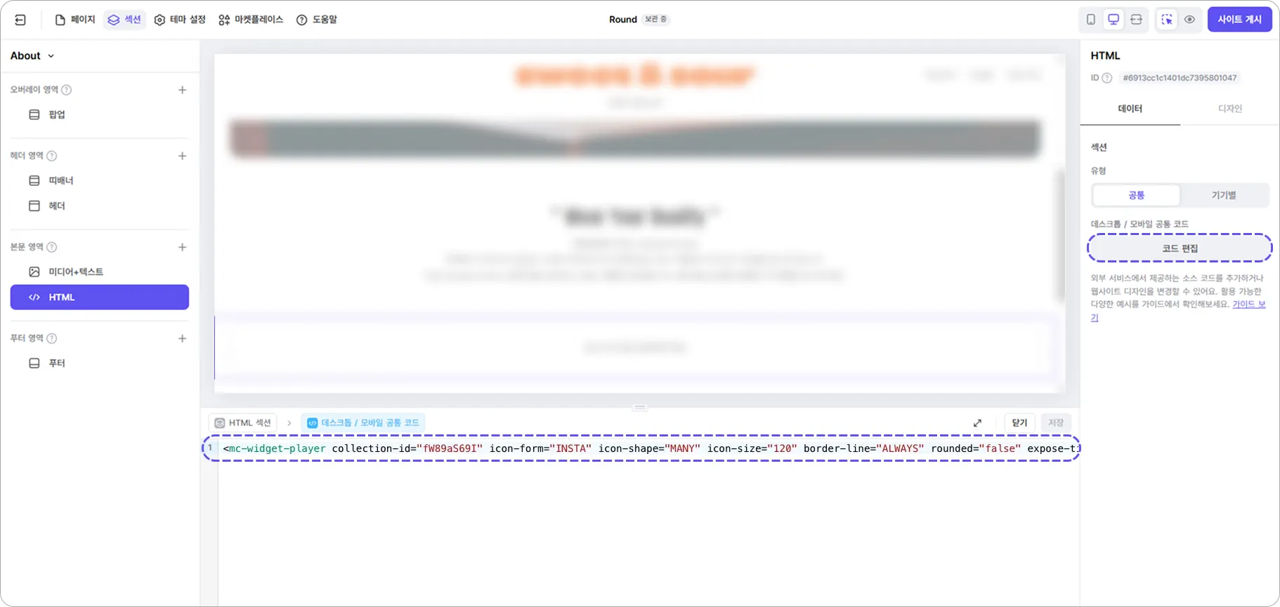 Step 3. 추가한 HTML 섹션에 미디버스 커머스 대시보드에서 복사한 숏폼, 컬렉션, 또는 위젯 코드를 붙여넣고 저장해 주세요.