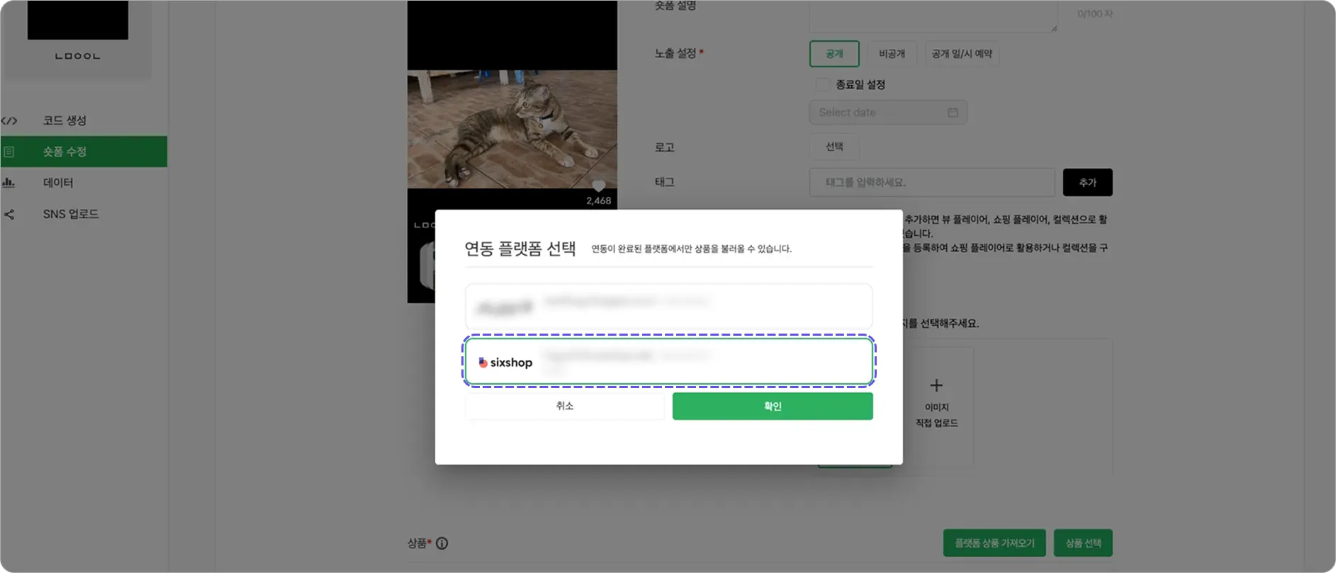Step 5. [숏폼 생성 또는 수정 > 상품 배너 추가 > 플랫폼 상품 가져오기]에서 식스샵을 선택해, 식스샵에 등록된 상품을 미디버스 커머스와 연동해 사용하세요.