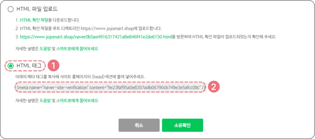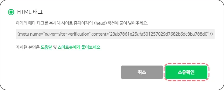 ③ 사이트 소유 확인 진행에서 HTML 태그 선택 후 메타태그를 복사