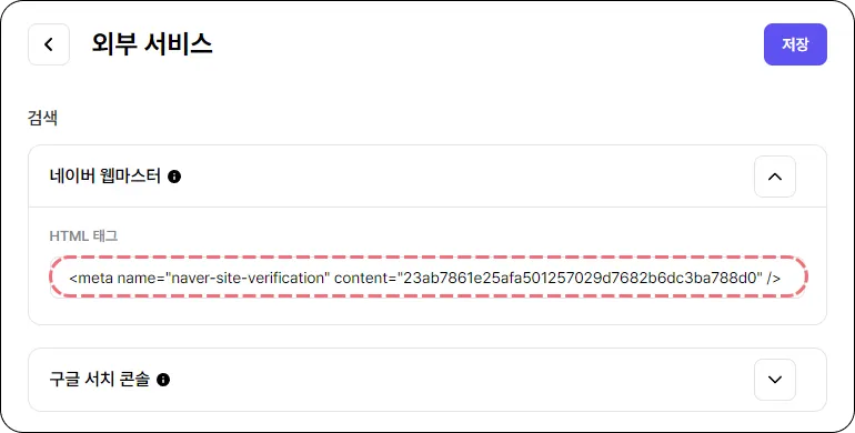④ [식스샵 프로 > 설정 > 외부 서비스]에서, 복사한 태그를 [검색 > 네이버 웹마스터]의 HTML 태그에 붙여 넣고 저장